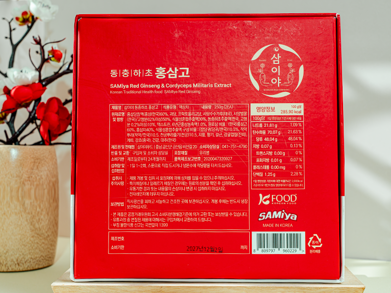 Cao Hồng Sâm Đông Trùng Samiya là sản phẩm bồi bổ sức khỏe cao cấp, kết tinh từ tinh hoa của hồng sâm 6 năm tuổi vùng Geumsan – thủ phủ sâm danh tiếng của Hàn Quốc, kết hợp cùng các thảo dược quý như nấm đông trùng hạ thảo, linh chi, bạch chỉ, xuyên khung… giúp nâng cao thể trạng, tăng sức đề kháng và cải thiện sinh lực toàn diện. Với hàm lượng saponin hơn 70mg/g, đặc biệt là ginsenoside Rg và Rb – hoạt chất quý hiếm, sản phẩm được xem như “thần dược” cho sức khỏe và sắc đẹp.